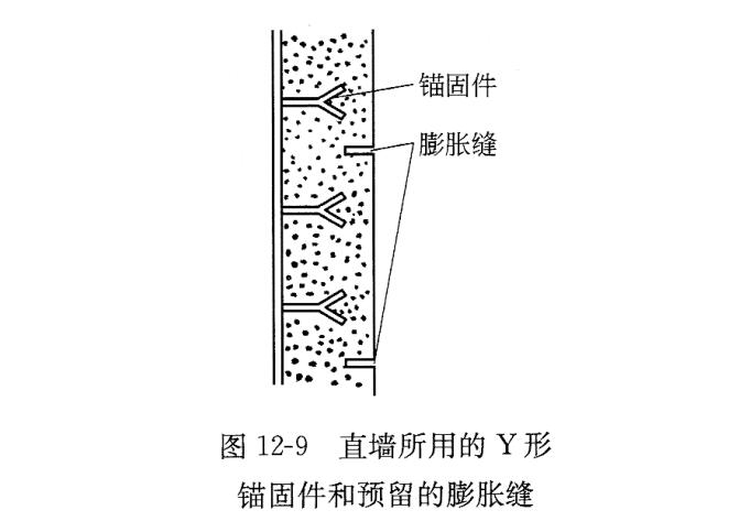 錨固件廣泛用于耐火澆注材料。金屬錨固件有Y形、V形、L型等形狀,截面呈圓形,也有其它形狀。圖12-9顯示了直墻所用的Y型錨固件和預留的膨脹縫。